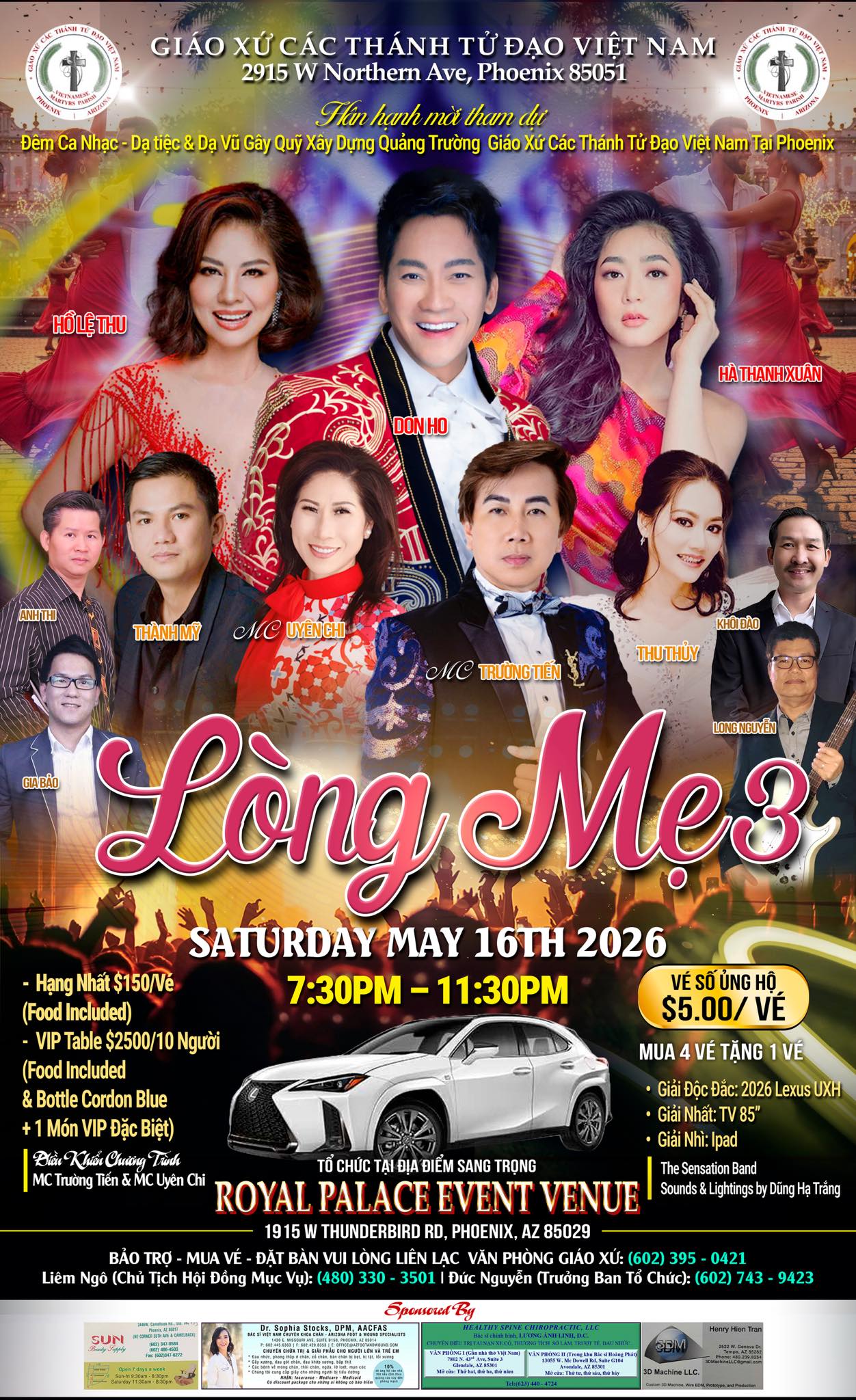 🎼Giáo Xứ Các Thánh Tử Đạo Việt Nam tọa lạc tại 2915 W Northern Ave, Phoenix 85051 tại Phoenix tổ chức đêm Ca Nhạc – Dạ Tiệc & Dạ Vũ Gây Quỹ Xây Dựng Quảng Trường Các Thánh Tử Đạo Việt Nam chủ đề Lòng Mẹ 3 ngày Thứ Bảy 16 tháng 5, 2026